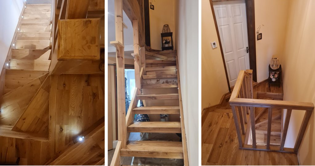 Oak facing on the stairs with led lights. New oak floor in landing and new oak banister
